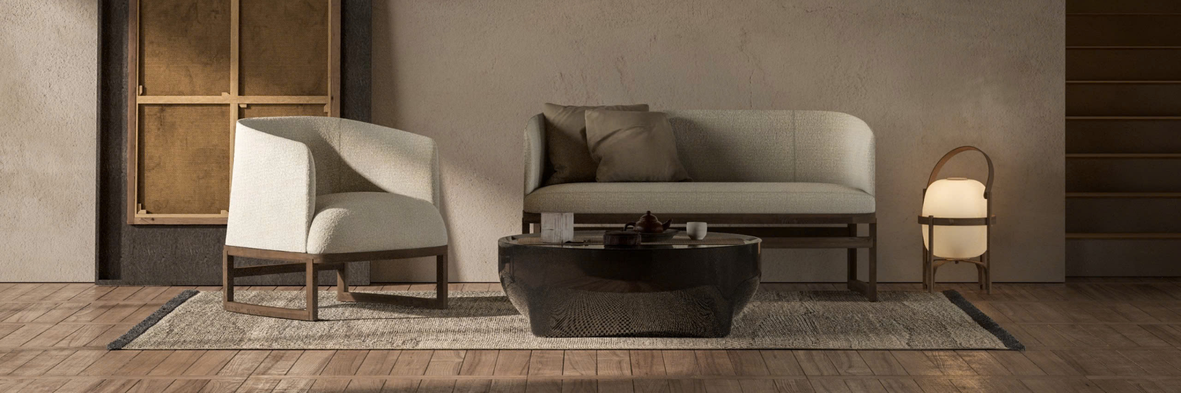 The Hida Collection balances visual elegance and functional efficiency, featuring upholstered forms resting on a sturdy sled-style wooden base, complemented by a refined leather strap.